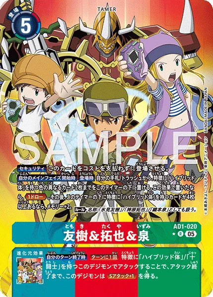 Start of Your Main Phase On Play You may place up to 2 [Hybrid] trait cards with different colors from your hand or trash under this Tamer. If this effect placed, Draw 1. Then, if there are 4 or more [Hybrid] trait cards under this Tamer, gain 2 memory. Rule Name: Also treated as [Tommy Himi]/[Takuya Kanbara]/[Zoe Orimoto].