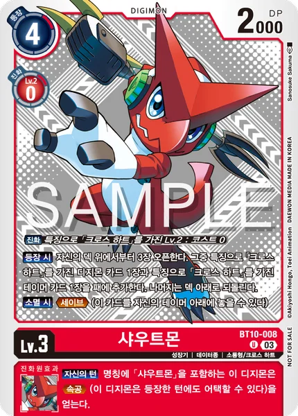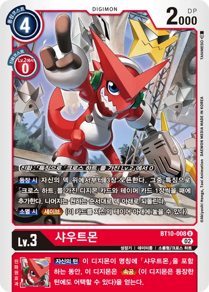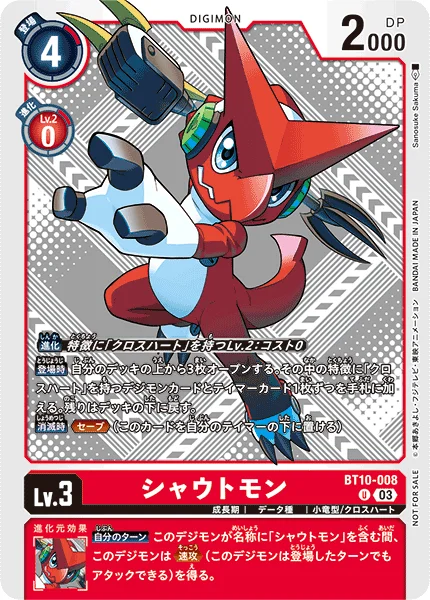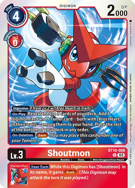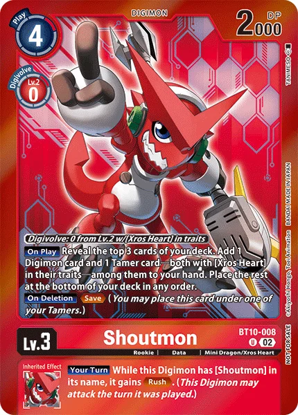 Your Turn While this Digimon has [Shoutmon] in its name, it gains Rush. (This Digimon may attack the turn it was played.)