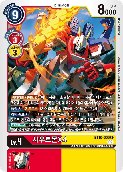 DigiXros -2 [Shoutmon] + [Ballistamon] + [Dorulumon] + [Starmons] When you would play this card, you may place specified cards from your hand/battle area under it. Each placed card reduces the play cost.