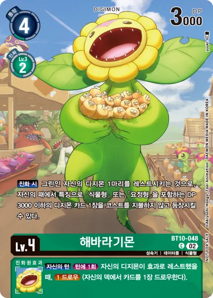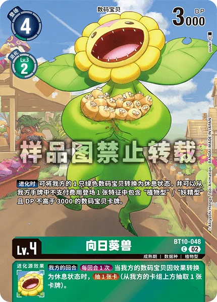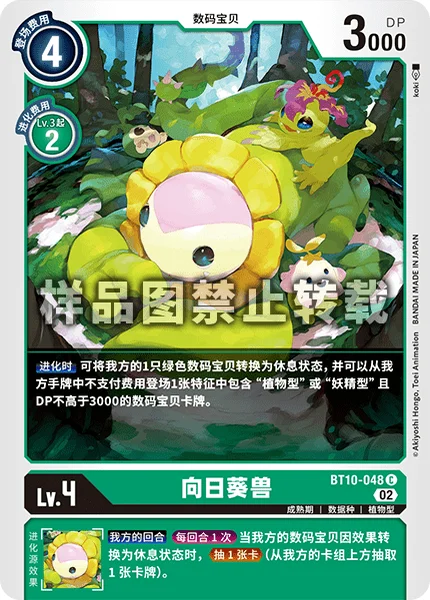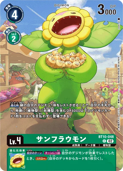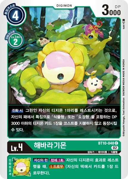 When Digivolving By suspending 1 of your green Digimon, you may play 1 Digimon card with [Vegetation] or [Fairy] in its traits and 3000 DP or less from your hand without paying its memory cost.