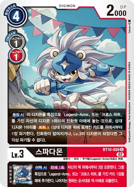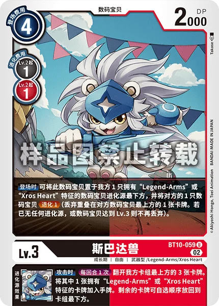 On Play By placing this Digimon under 1 of your Digimon with [Legend-Arms] or [Xros Heart] in its traits as its bottom digivolution card, De-Digivolve 1 1 of your opponent's Digimon. (Trash 1 card from the top of 1 of your opponent's Digimon. Stop trashing when you would trash a level 3 card or the Digimon's last card.)