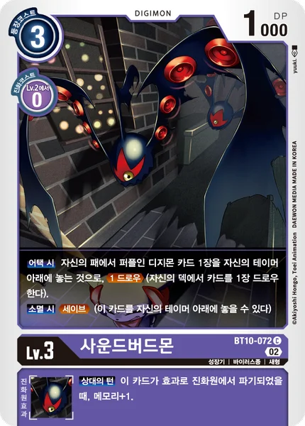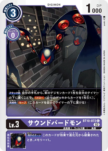 When Attacking By placing 1 purple Digimon card from your hand under one of your Tamers, Draw 1. (Draw 1 card from your deck.)