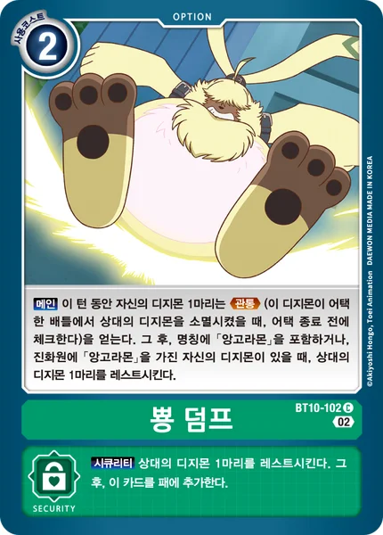 Main 1 of your Digimon gains Piercing for the turn. (When this Digimon attacks and deletes an opponent's Digimon, it performs any security checks it normally would.) Then, if you have a Digimon in play with [Angoramon] in its name or with [Angoramon] in its digivolution cards, suspend 1 of your opponent's Digimon.