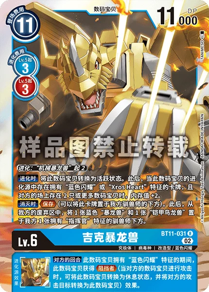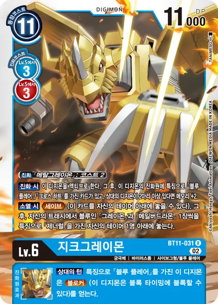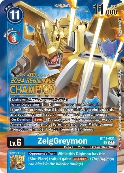 Digivolve 2 from [MetalGreymon]When Digivolving Unsuspend this Digimon. Then, if a card with [Blue Flare] or [Xros Heart] in its traits is in this Digimon's digivolution cards and your opponent has 2 or more Digimon in play, gain 2 memory.On Deletion Save. (You may place this card under one of your Tamers.) Then, place 1 blue [Greymon] and 1 blue [MailBirdramon] from your trash under 1 of your Tamers with [General] in its traits.