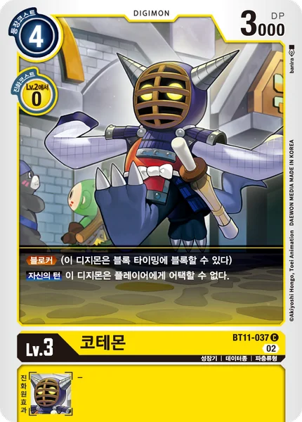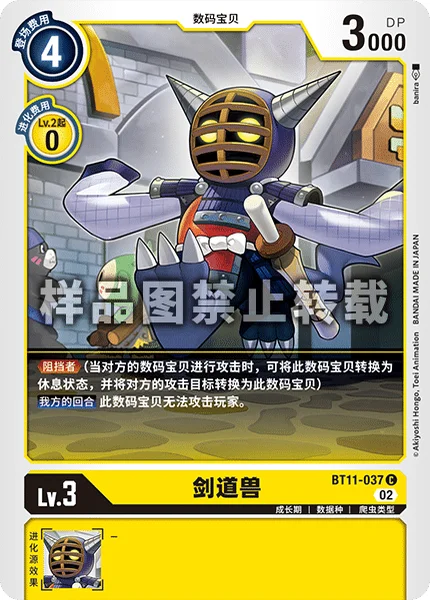 Blocker (When an opponent's Digimon attacks, you may suspend this Digimon to force the opponent to attack it instead.)Your Turn This Digimon can't attack players.