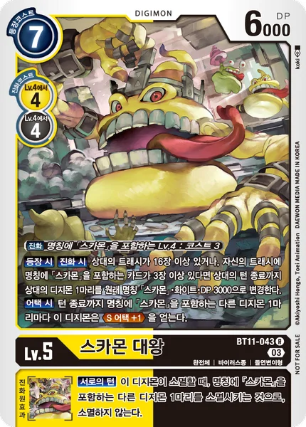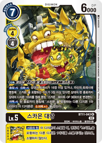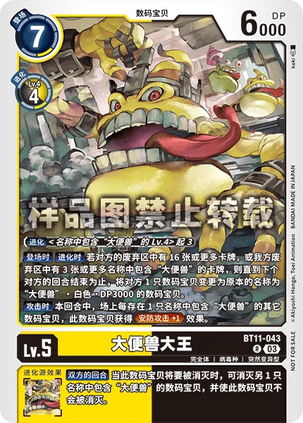 Digivolve 3 from Lv.4 w/[Sukamon] in nameOn PlayWhen Digivolving If your opponent has 16 or more cards in their trash, or you have 3 or more cards with [Sukamon] in their names in your trash, change 1 of your opponent's Digimon into a white Digimon with 3000 DP and an original name of [Sukamon] until the end of your opponent's turn.When Attacking For each other Digimon with [Sukamon] in its name in play, this Digimon gains Security Attack +1 for the turn.