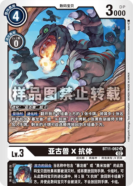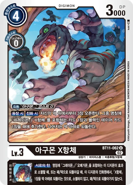 Digivolve 0 from [Agumon]On PlayWhen Digivolving Reveal the top 3 cards of your deck. Add 1 card with [Greymon] or [X Antibody] in its name and 1 black Tamer card among them to your hand. Place the rest at the bottom of your deck in any order.