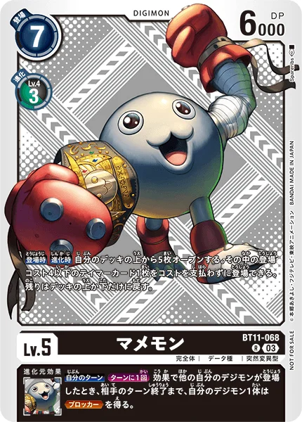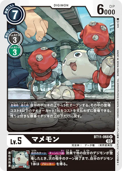 On PlayWhen Digivolving Reveal the top 5 cards of your deck. You may play 1 Tamer card with a play cost of 4 or less among them without paying the cost. Place the rest at the top or bottom of your deck in any order.