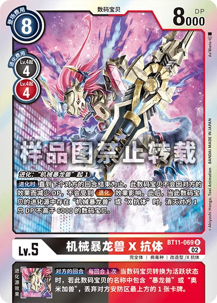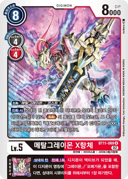 Digivolve 1 from [MetalGreymon]When Digivolving Until the end of your opponent's turn, this Digimon can't have its DP reduced by your opponent's effects, and isn't affected by De-Digivolve effects. Then, if [MetalGreymon] or [X Antibody] is in this Digimon's digivolution cards, delete 1 of your opponent's Digimon with 6000 DP or less.