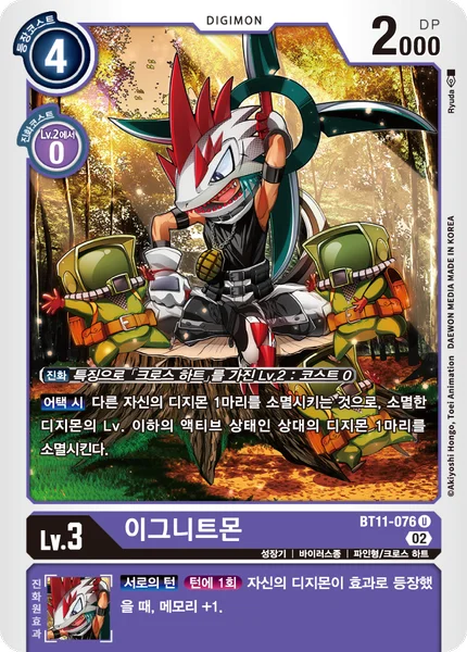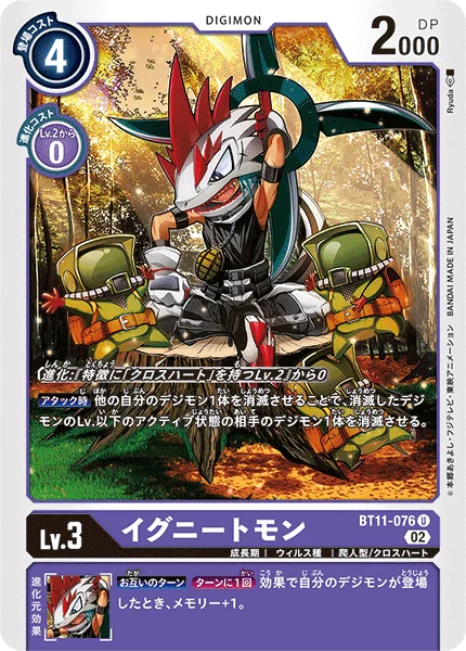 Digivolve 0 from Lv.2 w/[Xros Heart] in traitsWhen Attacking By deleting 1 of your other Digimon, delete 1 of your opponent's unsuspended Digimon with a level less than or equal to the deleted Digimon's level.