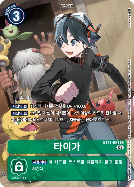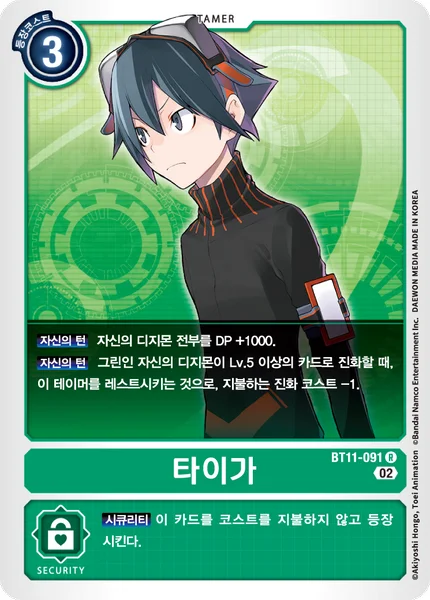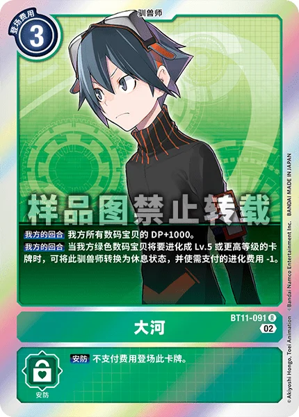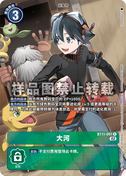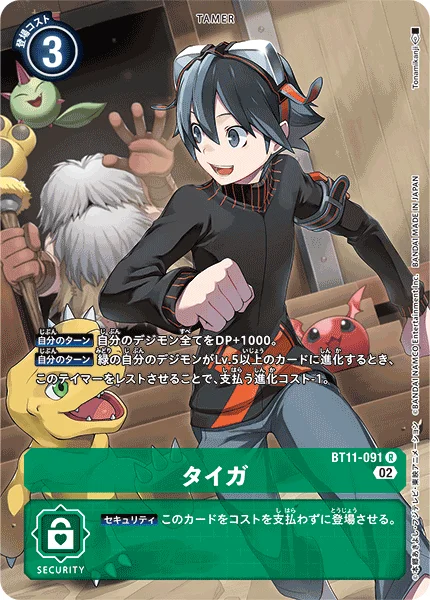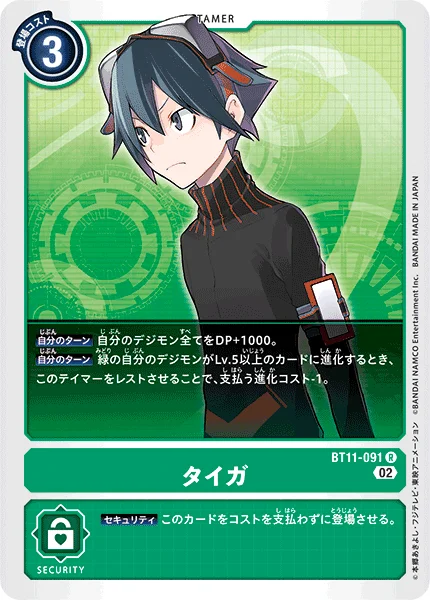 Your Turn All of your Digimon get +1000 DP.Your Turn When one of your green Digimon would digivolve into a level 5 or higher card, by suspending this Tamer, reduce the digivolution cost by 1.