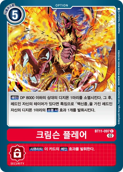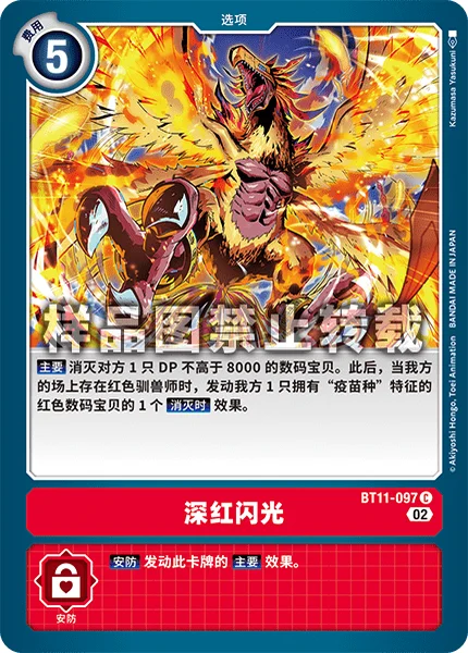 Main Delete 1 of your opponent's Digimon with 8000 DP or less. Then, if you have a red Tamer in play, activate 1 of the On Deletion effects of 1 of your red Digimon with [Vaccine] in its traits.