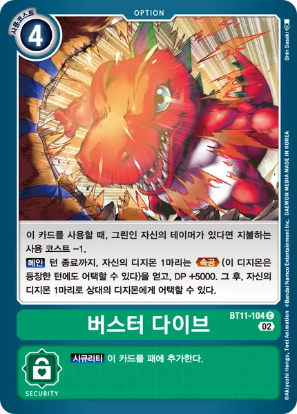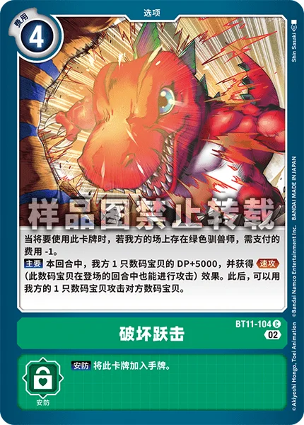 When you would use this card, if you have a green Tamer in play, reduce the cost by 1.Main 1 of your Digimon gets +5000 DP and gains Rush for the turn. (This Digimon may attack the turn it was played.) Then, 1 of your Digimon may attack your opponent's Digimon.