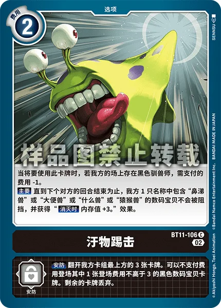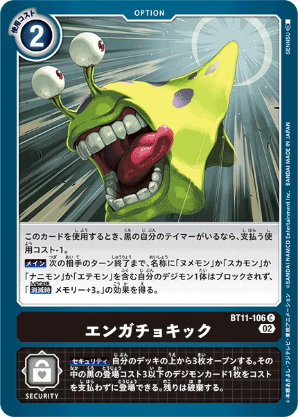 When you would use this card, if you have a black Tamer in play, reduce the cost by 1.Main Until the end of your opponent's turn, 1 of your Digimon with [Numemon], [Sukamon], [Nanimon], or [Etemon] in its name can't be blocked and gains "On Deletion Gain 3 memory."