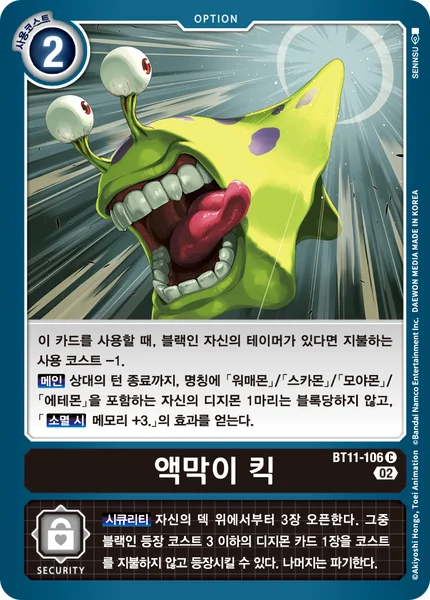 Security Reveal the top 3 cards of your deck. You may play 1 black Digimon card with a play cost of 3 or less among them without paying the cost. Trash the rest.