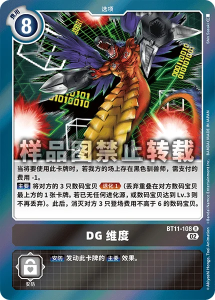 When you would use this card, if you have a black Tamer in play, reduce the cost by 1.Main De-Digivolve 1 3 of your opponent's Digimon. (Trash 1 card from the top of 3 of your opponent's Digimon. Stop trashing when you would trash a level 3 card or the Digimon's last card.) Then, delete 3 of your opponent's Digimon with play costs of 6 or less.