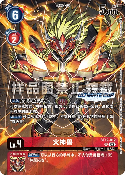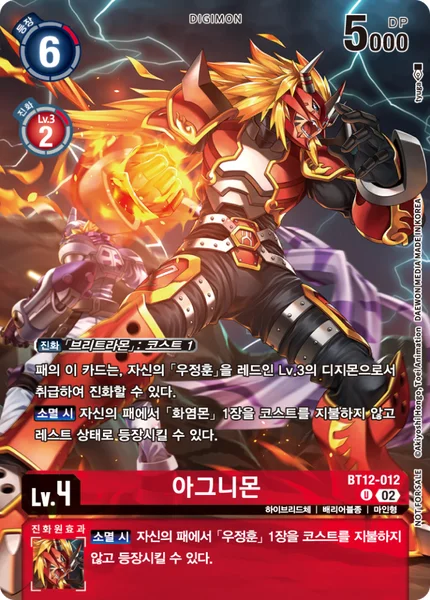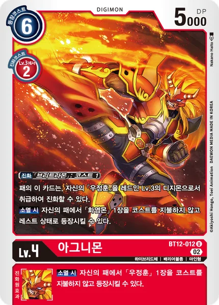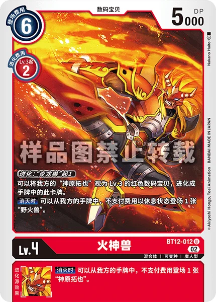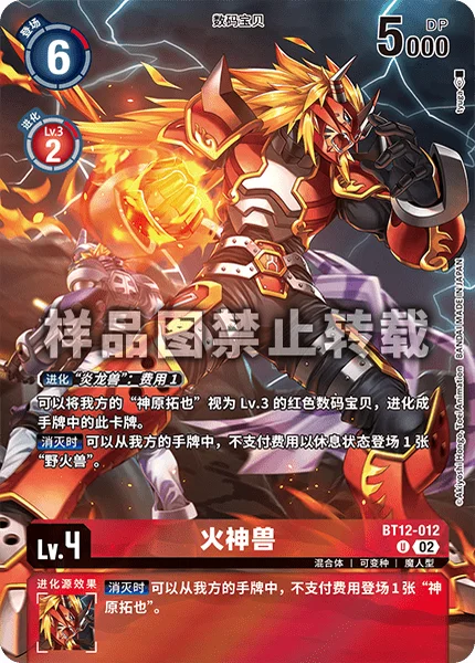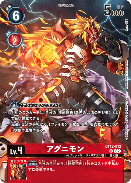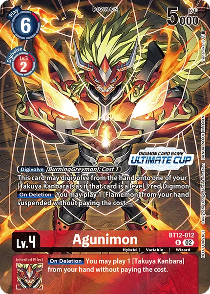 Digivolve 1 from [BurningGreymon] You may digivolve this card from your hand onto one of your [Takuya Kanbara] cards as if the Tamer is a level 3 red Digimon.On Deletion You may play 1 [Flamemon] from your hand suspended without paying its cost.
