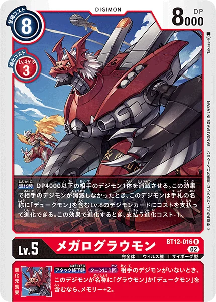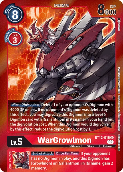 End of AttackOnce Per Turn When your opponent has no Digimon in play, if this Digimon has [Growlmon] or [Gallantmon] in its name, gain 2 memory.