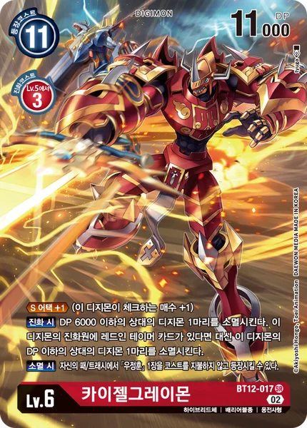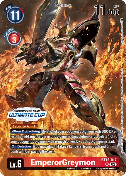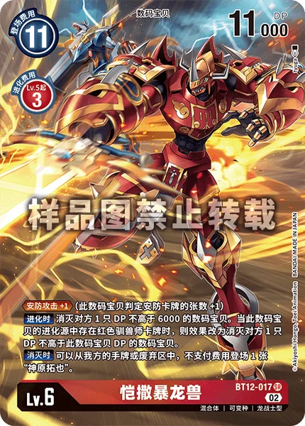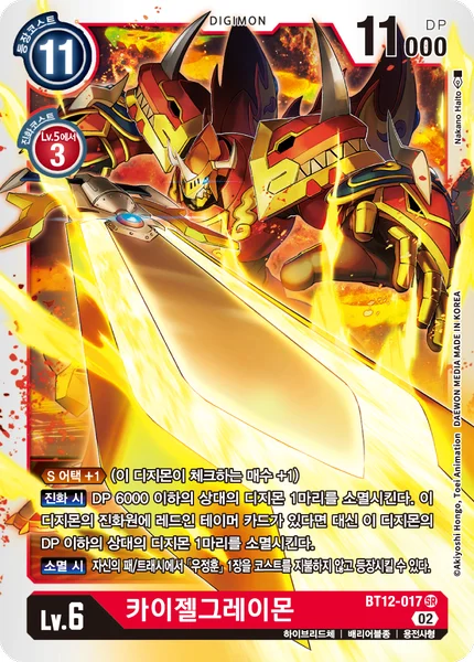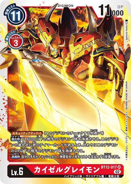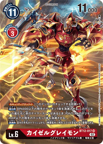 Security Attack +1. (This Digimon checks 1 additional security card.)When Digivolving Delete 1 of your opponent's Digimon with 6000 DP or less. If this Digimon has a red Tamer in its digivolution cards, delete 1 of your opponent's Digimon with DP less than or equal to this Digimon's DP instead.On Deletion You may play 1 [Takuya Kanbara] from your hand or trash without paying its cost.