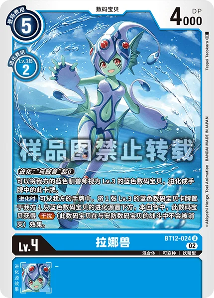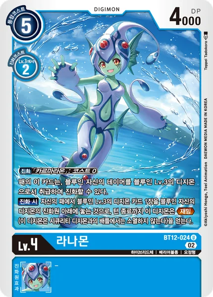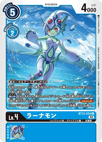 Digivolve 0 from [Calmaramon] You may digivolve this card from your hand onto one of your blue Tamers as if the Tamer is a level 3 blue Digimon.When Digivolving By placing a blue level 3 Digimon card from your hand under 1 of your blue Digimon as its bottom digivolution card, this Digimon gains Jamming for the turn. (This Digimon can't be deleted in battles against Security Digimon.)