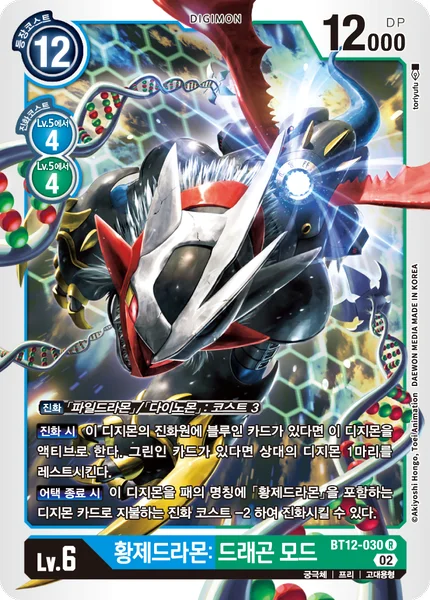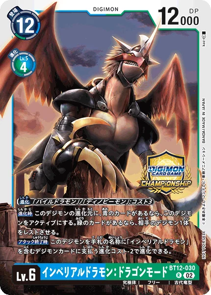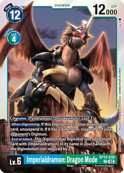 Digivolve 3 from [Paildramon] or [Dinobeemon]When Digivolving If this Digimon has a blue card in its digivolution cards, unsuspend this Digimon. If it has a green digivolution card, suspend 1 of your opponent's Digimon. End of Attack You may digivolve this Digimon into a Digimon card with [Imperialdramon] in its name in your hand for its digivolution cost. If this Digimon would digivolve with this effect, reduce the digivolution cost by 2.