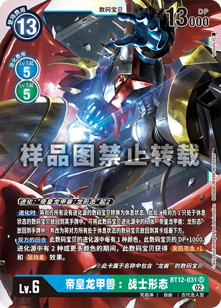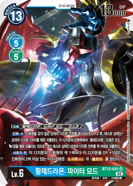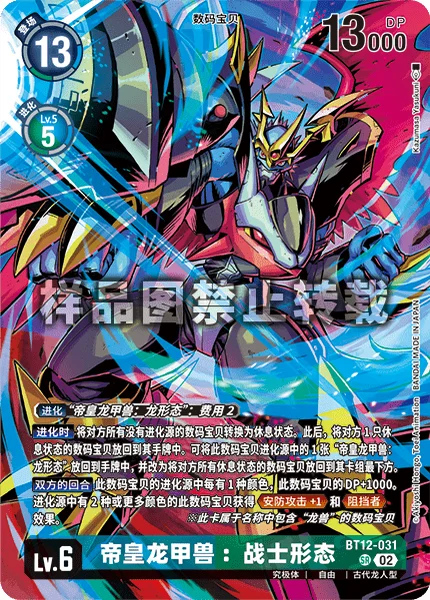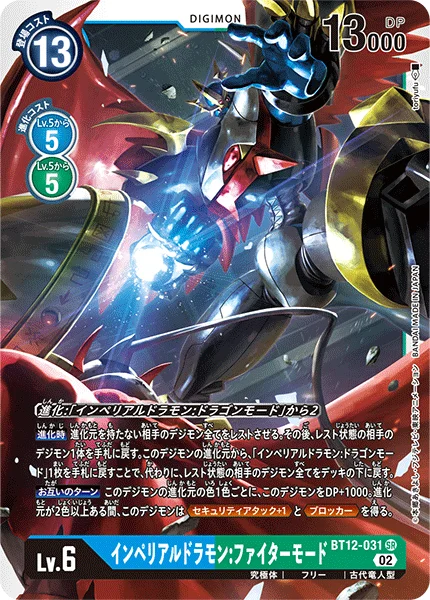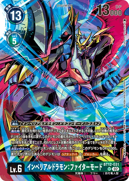 Digivolve 2 from [Imperialdramon: Dragon Mode]When Digivolving Suspend all of your opponent's Digimon with no digivolution cards. Then, return 1 of your opponent's suspended Digimon to its owner's hand. By returning 1 [Imperialdramon: Dragon Mode] card from this Digimon's digivolution cards to its owner's hand, place all of your opponent's suspended Digimon at the bottom of their owners' decks instead.All Turns This Digimon gets +1000 DP for each of its digivolution card colors. While this Digimon has 2 or more colors, it gains Security Attack +1 and Blocker.