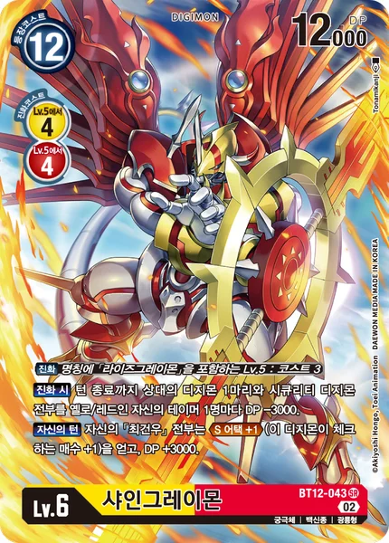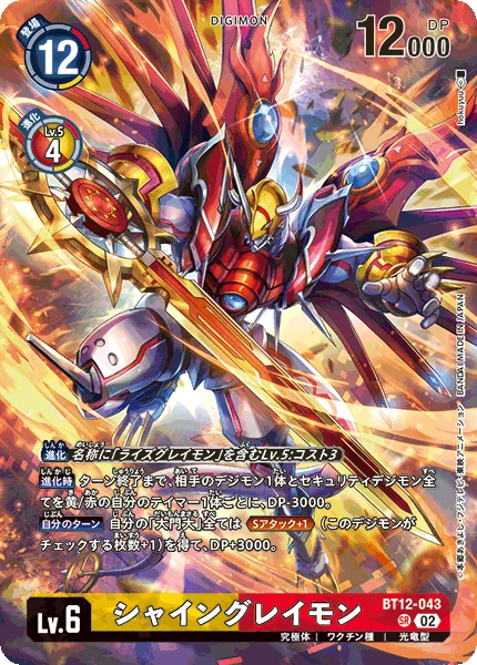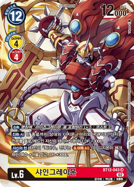 Digivolve 3 from Lv.5 w/[RizeGreymon] in name When Digivolving For each yellow or red Tamer you have in play, 1 of your opponent's Digimon and all of your opponent's Security Digimon get -3000 DP for the turn.Your Turn All of your [Marcus Damon] cards in play get +3000 DP and Security Attack +1. (This Digimon checks 1 additional security card.)