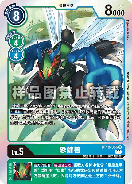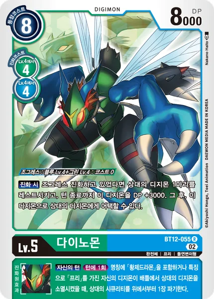 DNA Digivolution 0 fromBlueLv.4 +GreenLv.4 Digivolve unsuspended with the 2 specified Digimon stacked on top of each other.When Digivolving If DNA digivolving, suspend 1 of your opponent's Digimon, and this Digimon gets +3000 DP for the turn. Then, you may attack your opponent's Digimon with this Digimon.