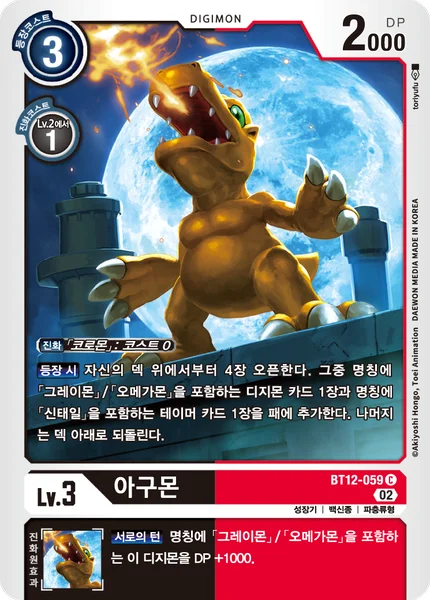 Digivolve 0 from [Koromon]On Play Reveal the top 4 cards of your deck. Add 1 Digimon card with [Greymon] or [Omnimon] in its name and 1 Tamer card with [Tai Kamiya] in its name among them to your hand. Place the remaining cards at the bottom of your deck in any order.