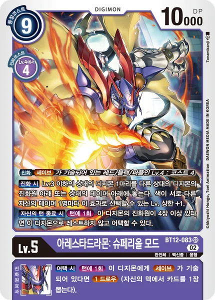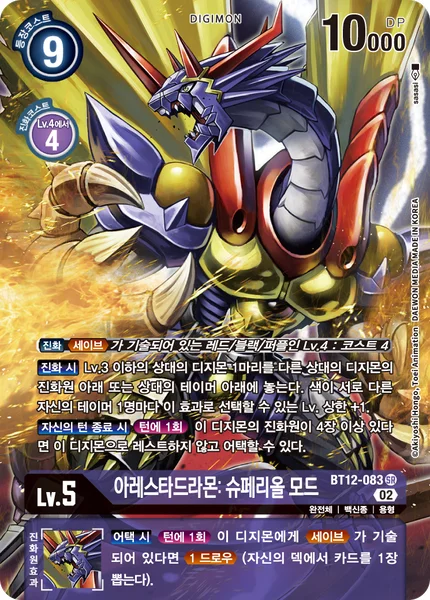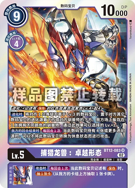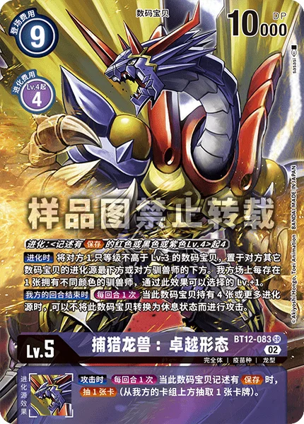 Digivolve 4 from red, black, or purple Lv.4 w/Save in text When Digivolving Place one of your opponent's level 3 or lower Digimon under another of your opponent's Digimon as its bottom digivolution card or under an opponent's Tamer. Add 1 to the max level of the Digimon you can choose with this effect for each differently colored Tamer you have in play.End of Your TurnOnce Per Turn If there are 4 or more digivolution cards under this Digimon, you may attack with this Digimon without suspending it.