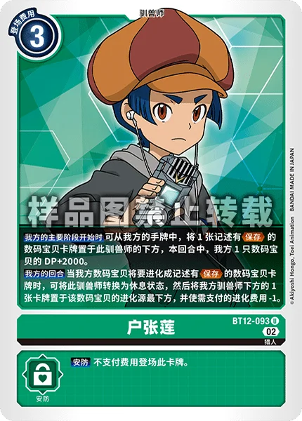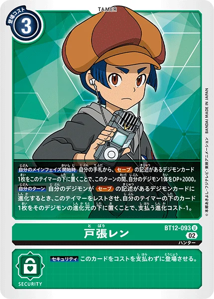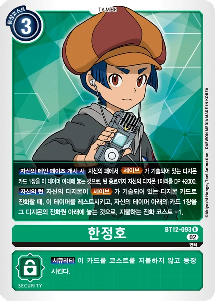 Start of Your Main Phase By placing 1 Digimon card with Save in its text from your hand under this Tamer, 1 of your Digimon gets +2000 DP for the turn.Your Turn If one of your Digimon digivolves into a Digimon card with Save in its text, by suspending this Tamer and placing 1 card from under one of your Tamers under that Digimon as one of its digivolution cards, reduce the digivolution cost by 1.