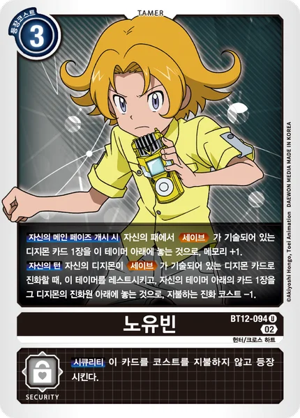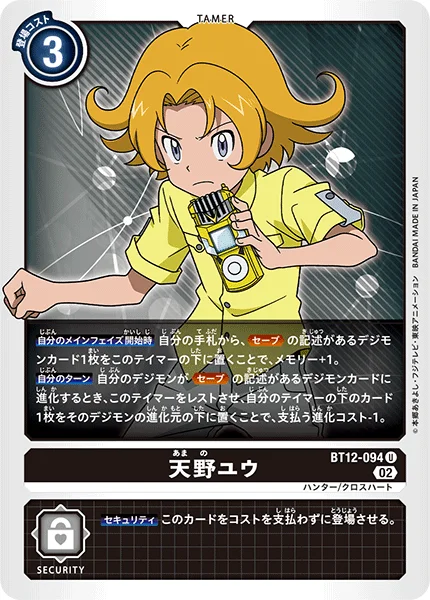 Start of Your Main Phase By placing 1 Digimon card with Save in its text from your hand under this Tamer, gain 1 memory.Your Turn If one of your Digimon digivolves into a Digimon card with Save in its text, by suspending this Tamer and placing 1 card from under one of your Tamers under that Digimon as one of its digivolution cards, reduce the digivolution cost by 1.