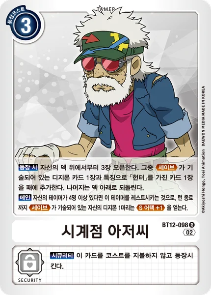 On Play Reveal the top 3 cards of your deck. Add 1 Digimon card with Save in its text and 1 card with a [Hunter] trait among them to your hand. Place the remaining cards at the bottom of your deck in any order.Main If you have 4 or more Tamers in play, by suspending this Tamer, 1 of your Digimon with Save in its text gains Security Attack +1 for the turn.