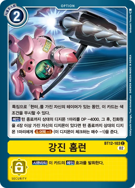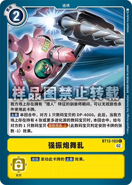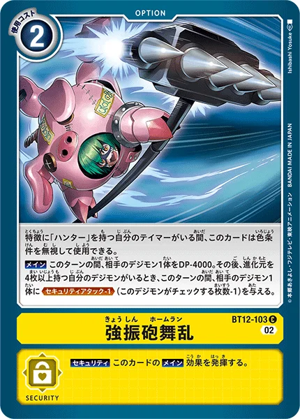 While you have a Tamer with a [Hunter] trait in play, you may use this card without meeting its color requirements.Main 1 of your opponent's Digimon gets -4000 DP for the turn. Then, if you have a Digimon with 4 or more digivolution cards in play, 1 of your opponent's Digimon gains Security Attack -1 for the turn. (This Digimon checks 1 fewer security cards.)