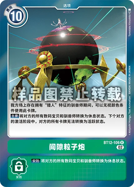 While you have a Tamer with a [Hunter] trait in play, you may use this card without meeting its color requirements.Main Suspend all of your opponent's Digimon and Tamers. Your opponent's cards don't unsuspend during their next unsuspend phase.