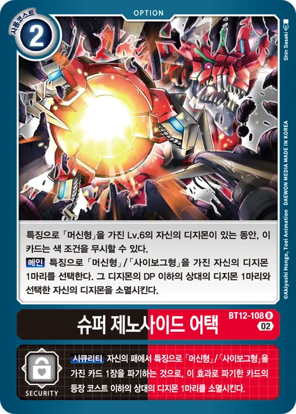 Security By trashing 1 card with a [Cyborg] or [Machine] trait from your hand, delete 1 of your opponent's Digimon with a play cost less than or equal to the trashed card.