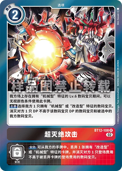 While you have a level 6 Digimon with a [Machine] trait in play, you may use this card without meeting its color requirements.Main Choose 1 of your Digimon with a [Machine] or [Cyborg] trait. Delete 1 of your opponent's Digimon with DP less than or equal to that Digimon and delete your chosen Digimon.
