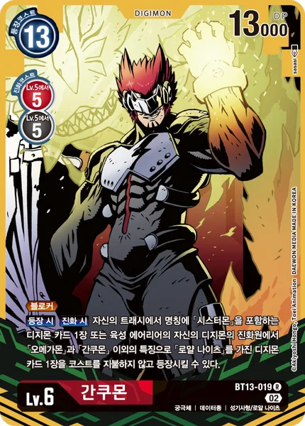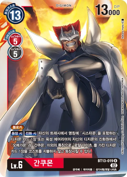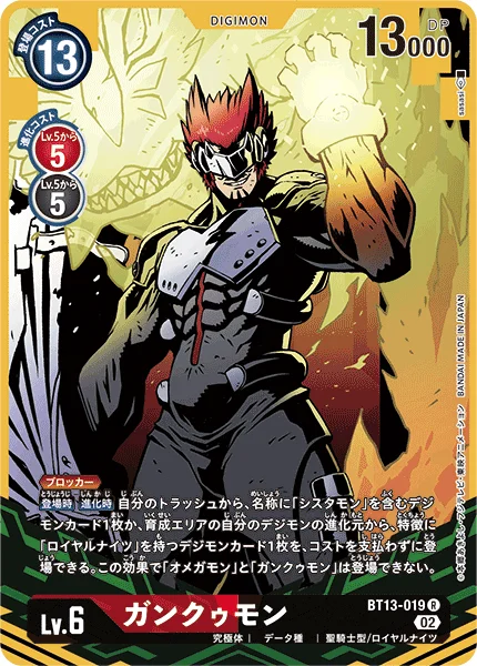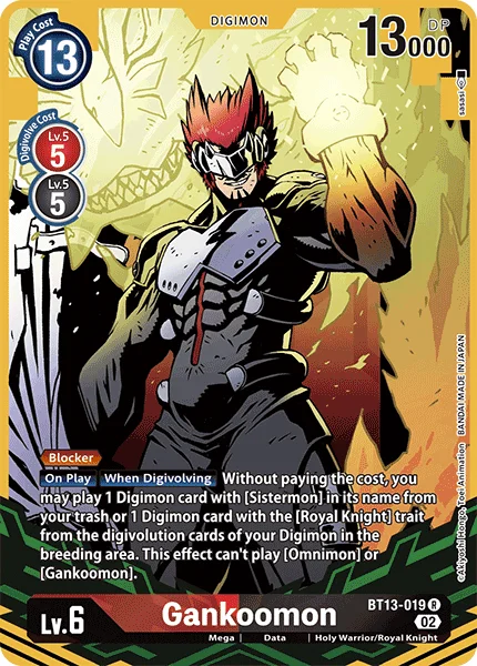 On PlayWhen Digivolving Without paying the cost, you may play 1 Digimon card with [Sistermon] in its name from your trash or 1 Digimon card with the [Royal Knight] trait from the digivolution cards of your Digimon in the breeding area. This effect can't play [Omnimon] or [Gankoomon].