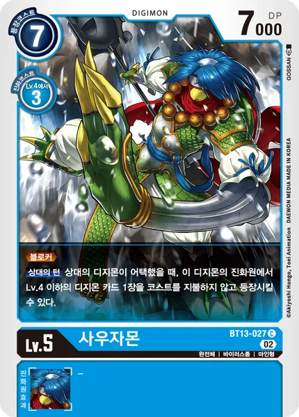 Opponent's Turn When an opponent's Digimon attacks, you may play 1 level 4 or lower Digimon card from this Digimon's digivolution cards without paying the cost.
