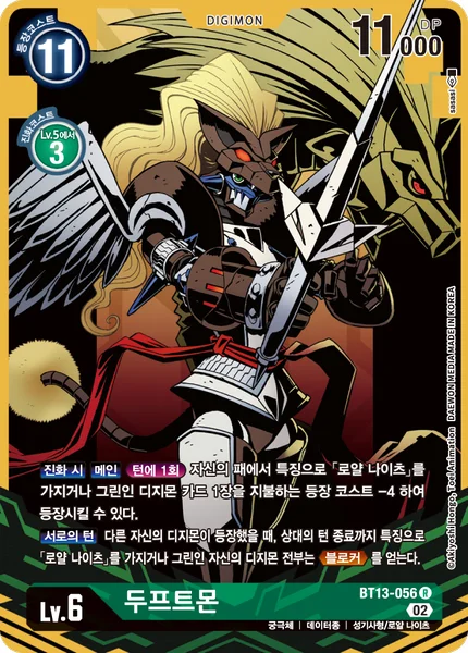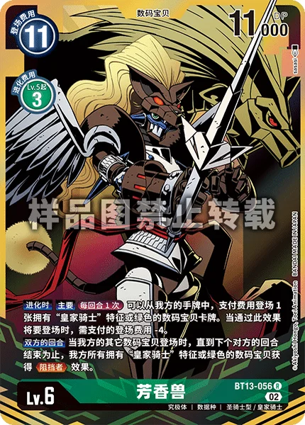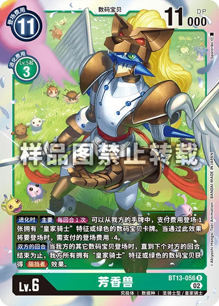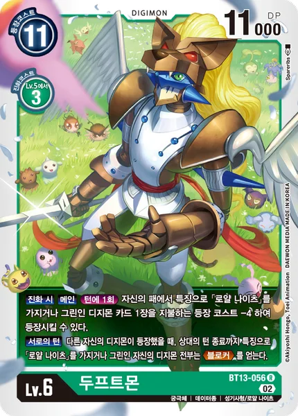 All Turns When you play another Digimon, all of your green and/or [Royal Knight] trait Digimon gain Blocker until the end of your opponent's turn.