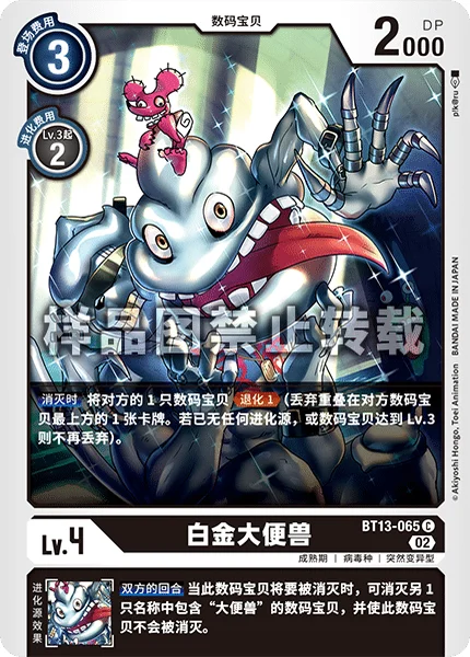 On Deletion De-Digivolve 1 1 of your opponent's Digimon. (Trash 1 card from the top of 1 of your opponent's Digimon. Stop trashing when you would trash a level 3 card or the Digimon's last card.)