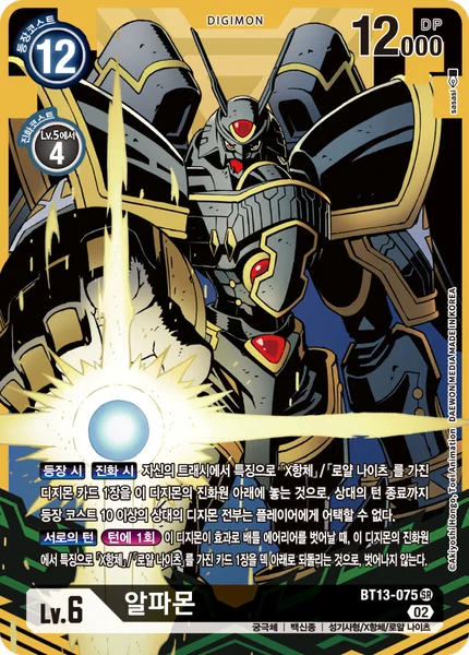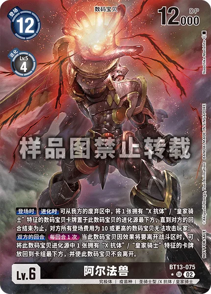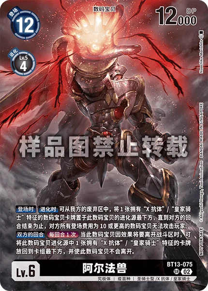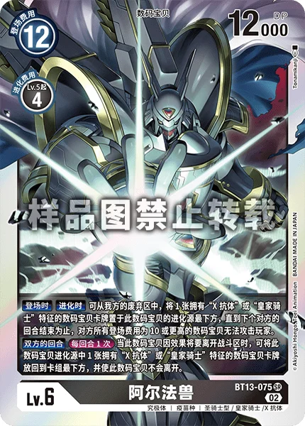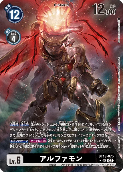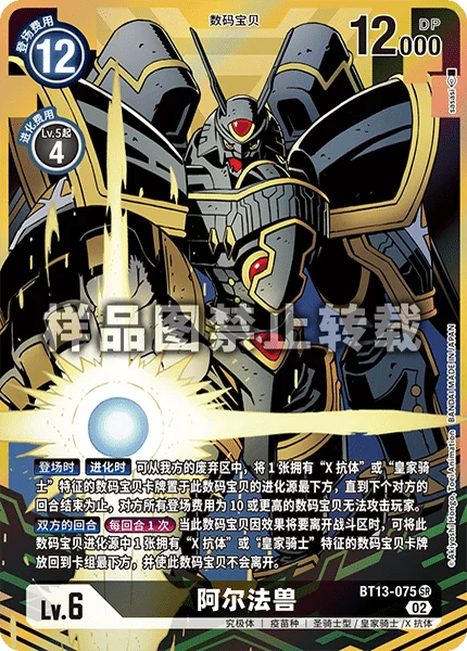 On PlayWhen Digivolving By placing 1 Digimon card with the [X Antibody] or [Royal Knight] trait from your trash as this Digimon's bottom digivolution card, all of your opponent's play cost 10 or higher Digimon can't attack players until the end of their turn.