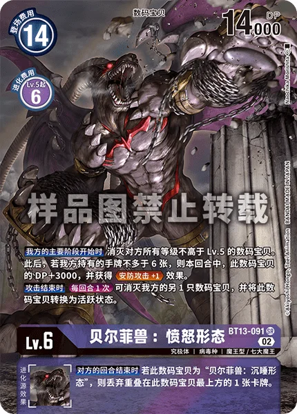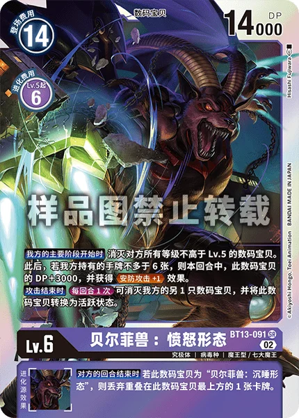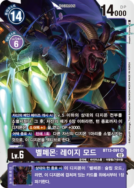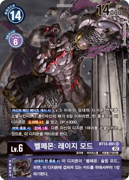 Start of Your Main Phase Delete all of your opponent's level 5 or lower Digimon. Then, if you have 6 or fewer cards in your hand, this Digimon gets +3000 DP and gains Security Attack +1 for the turn.