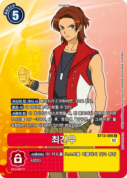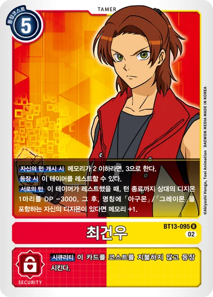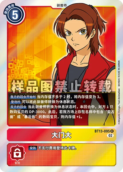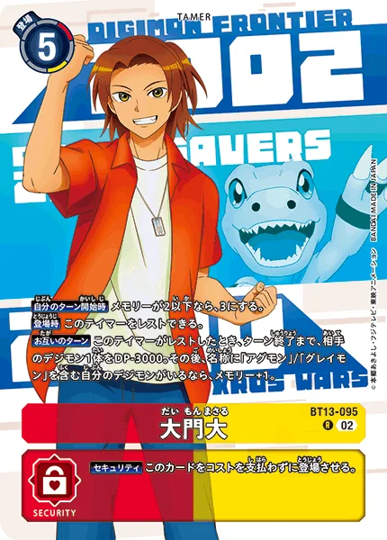 All Turns When this Tamer suspends, 1 of your opponent's Digimon gets -3000 DP for the turn. Then, if you have a Digimon with [Agumon] or [Greymon] in its name, gain 1 memory.