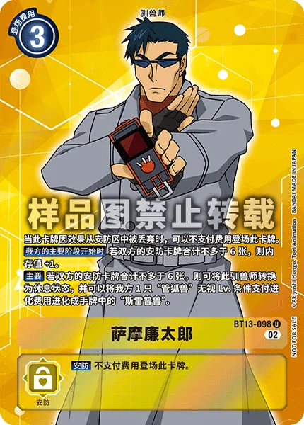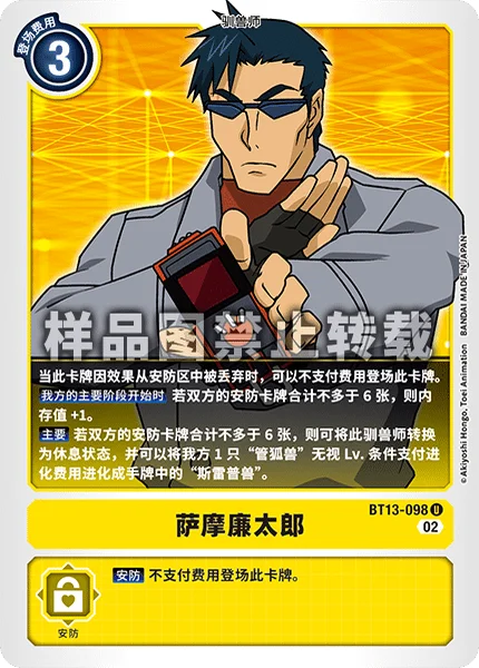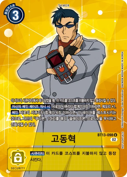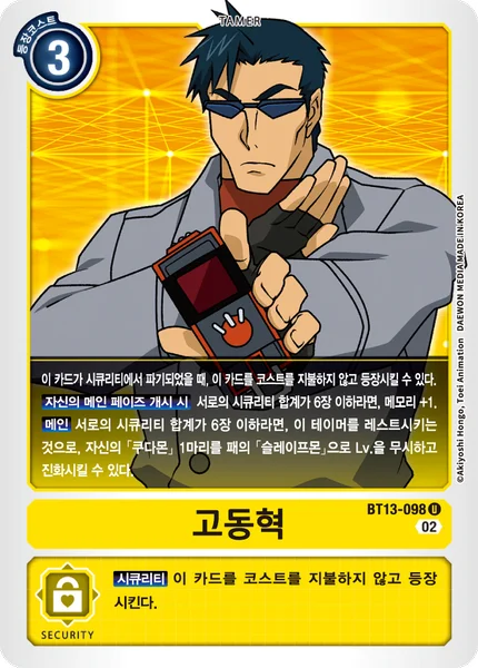 Main If there're 6 or fewer total cards in both players' security stacks, by suspending this Tamer, 1 of your [Kudamon] may digivolve into [Kentaurosmon] in the hand for the digivolution cost, ignoring its level.