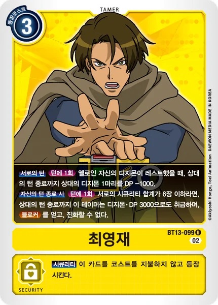 End of Your TurnOnce Per Turn If there're 6 or fewer total cards in both players' security stacks, until the end of your opponent's turn, this Tamer is also treated as a 3000 DP Digimon, can't digivolve, and gains Blocker.