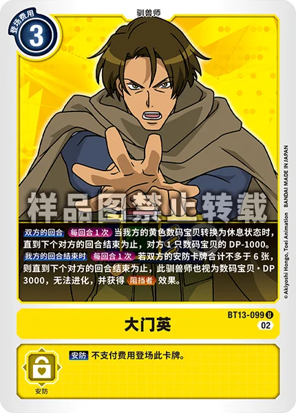 All TurnsOnce Per Turn When one of your yellow Digimon becomes suspended, 1 of your opponent's Digimon gets -1000 DP until the end of your opponent's turn.