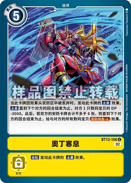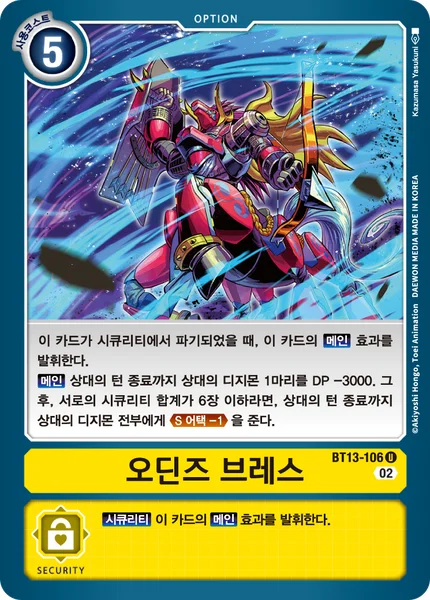 Main 1 of your opponent's Digimon gets -3000 DP until the end of your opponent's turn. Then, if there're 6 or fewer total cards in both players' security stacks, all of your opponent's Digimon gain Security Attack -1 until the end of your opponent's turn.