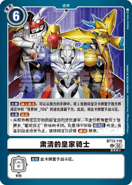 ・ Play 1 [Royal Knight] trait card from the digivolution cards of your Digimon in the breeding area without paying the cost. On Play effects don't activate for this play, and that Digimon gains Rush for the turn.