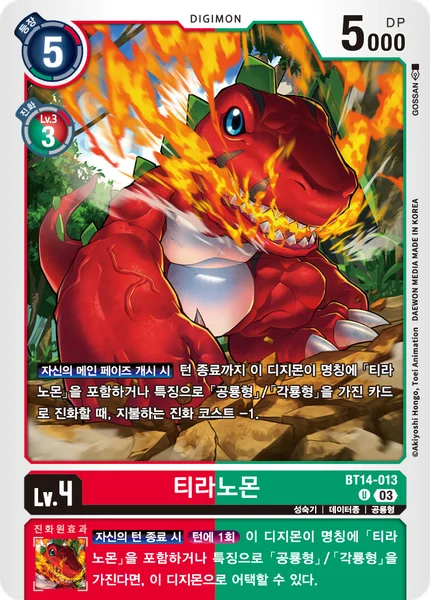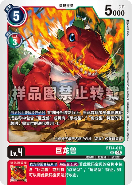 Start of Your Main Phase For the turn, when this Digimon would digivolve into a card with [Tyrannomon] in its name, or the [Dinosaur] or [Ceratopsian] trait, reduce the digivolution cost by 1.